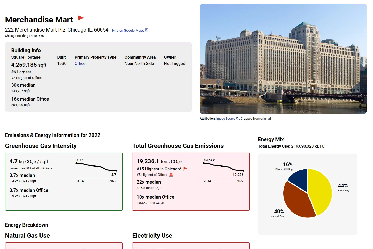 We added new graphs to help visualize how buildings have changed in their emissions, emissions intensity, and energy use over time, and a new pie chart that shows the mix of types of energy a building consumes, making it easy to see at a glance if a building is mostly using electricity, fossil gas, or something else!