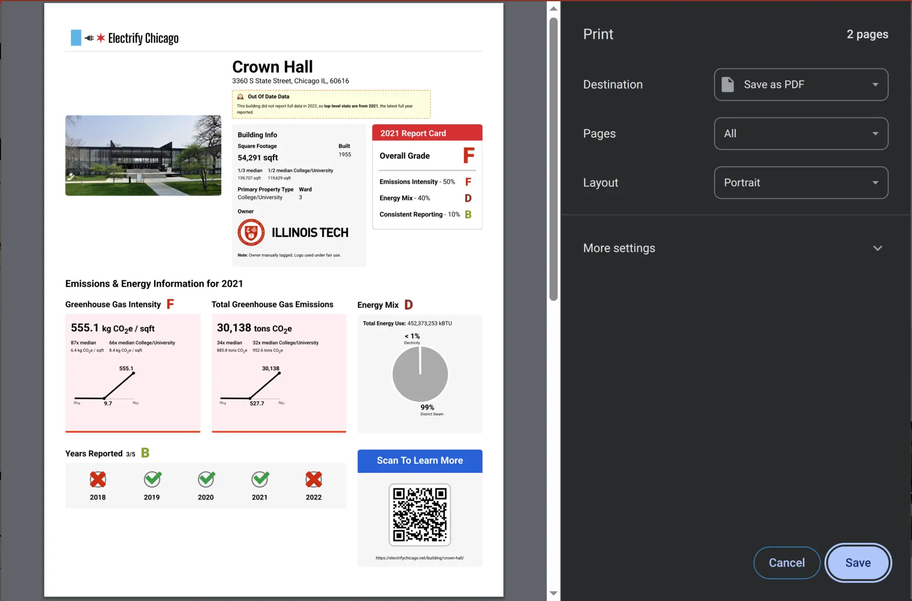 We added a new print button that makes it easy to print our building pages, so you can print off a building that you're interested in. Our print mode removes navigation elements to focus on the building data and make pages more suitable for printing or saving as PDFs, including a QR code so folks who see the printed page can see the full data.